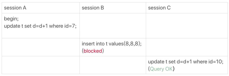 所以,session B 要插入 id=8 的记录会被锁住,而 session 修改 id=10 这行是可以的。
