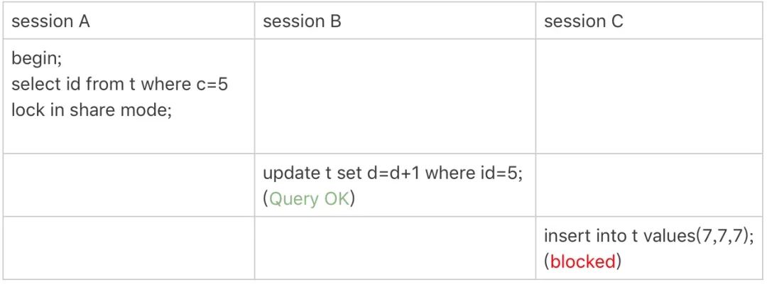 session C 中插入一个 c 为 7 的值,c 为 7 的值在 (5,10) 之间,因此会被锁住。