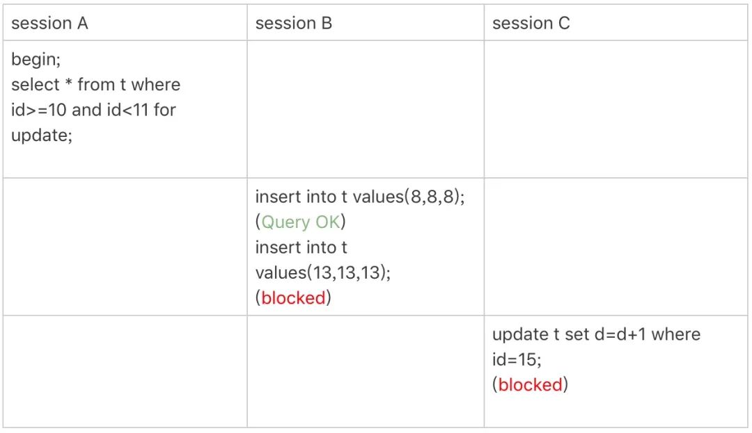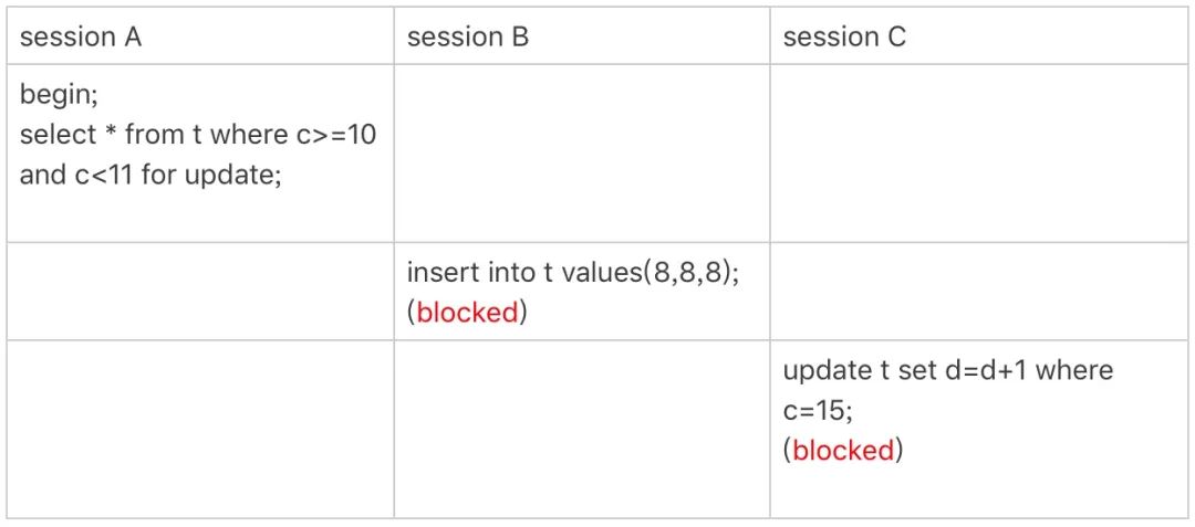 所以当 session B 和 session C 要操作 c 值为 8 和 15 的数据时会被阻塞。
