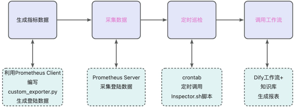 通常在日常运维中,我们会关注 CPU、磁盘、内存等硬件资源的健康状况,而这里我将巡检对象替换成了“用户登录信息”,以此作为示例。流程是这样的:首先通过自定义的 Prometheus Exporter 生成用户登录相关的指标数据;然后由 Prometheus Server 来采集这些指标;接着使用 crontab 配合定时脚本(inspector.sh)周期性地巡检和获取数据;最后,脚本会调用 Dify 的工作流,免费信息发布网将巡检结果进一步加工,结合知识库和脚本逻辑生成一份清晰的报告。这样做的意义在于:不仅实现了定时化、自动化的巡检,而且把数据采集、指标处理和智能化的结果生成串联起来,形成一个可复用的运维自动化方案。换句话说,这篇文章的核心,是通过“登录指标替代传统硬件指标”的例子,向读者展示如何用 Prometheus + 定时任务 + Dify 工作流,把常见的运维巡检场景落地成一个完整的自动化闭环。