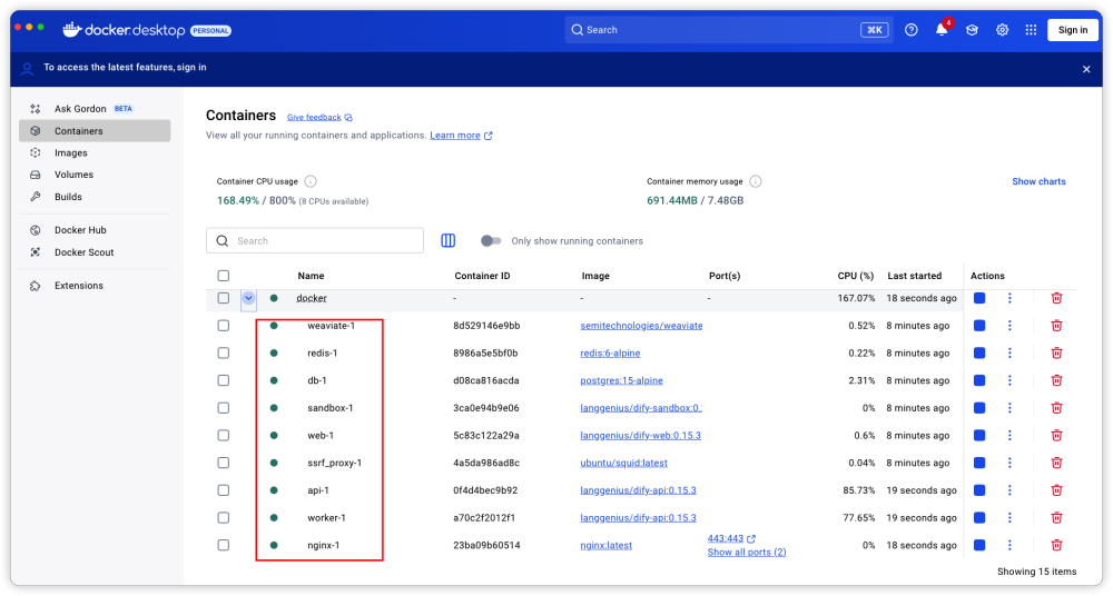 复制NAME IMAGE COMMAND SERVICE CREATED STATUS PORTS docker-api-1 langgenius/dify-api:0.6.13 "/bin/bash /entrypoi…" api About a minute ago Up About a minute 5001/tcp docker-db-1 postgres:15-alpine "docker-entrypoint.s…" db About a minute ago Up About a minute (healthy) 5432/tcp docker-nginx-1 nginx:latest "sh -c cp /docker-e…" nginx About a minute ago Up About a minute 0.0.0.0:80->80/tcp, :::80->80/tcp, 0.0.0.0:443->443/tcp, :::443->443/tcp docker-redis-1 redis:6-alpine "docker-entrypoint.s…" redis About a minute ago Up About a minute (healthy) 6379/tcp docker-sandbox-1 langgenius/dify-sandbox:0.2.1 "/main" sandbox About a minute ago Up About a minute docker-ssrf_proxy-1 ubuntu/squid:latest "sh -c cp /docker-e…" ssrf_proxy About a minute ago Up About a minute 3128/tcp docker-weaviate-1 semitechnologies/weaviate:1.19.0 "/bin/weaviate --hos…" weaviate About a minute ago Up About a minute docker-web-1 langgenius/dify-web:0.6.13 "/bin/sh ./entrypoin…" web About a minute ago Up About a minute 3000/tcp docker-worker-1 langgenius/dify-api:0.6.13 "/bin/bash /entrypoi…" worker About a minute ago Up About a minute 5001/tcp1.2.3.4.5.6.7.8.9.10.通过这些步骤,你可以在本地成功安装 Dify。通过 Docker Desktop 看到的就是如下图的样子。