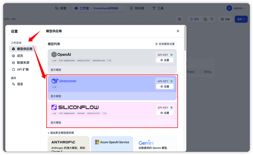 在用户的“配置”界面,点击“模型供应商”,添加如下图所示的供应商。
