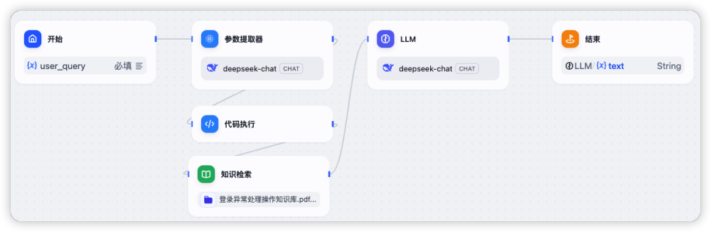 获取参数(参数提取器):从用户的自然语言中,提取登录总人数,登录异常人数等信息。得到方案(代码执行):通过代码判断异常登录比例,从而提供基本解决方案。细化方案(知识检索):输入基本解决方案,通过知识库检索详细解决方案。在知识库中保存着所有运维的解决方案信息。生成报表( LLM):根据详细解决方案生成运维报表。