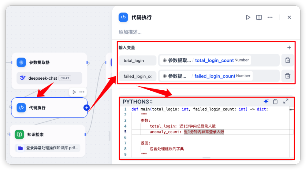 复制提取 “总登录人数”:文本中 “一共 XX 人登录” 里的 “XX” 数值,对应参数名 “total_login_count”(仅保留数字,如 “15680”); 提取 “成功登录人数”:文本中 “成功 XX 人” 里的 “XX” 数值,对应参数名 “success_login_count”(仅保留数字,如 “14739”); 提取 “失败登录人数”:文本中 “失败 XX 人” 里的 “XX” 数值,对应参数名 “failed_login_count”(仅保留数字,如 “941”);1.2.3.获取关键信息之后,会通过“代码执行”判断采取的具体方案。由于“代码执行”是“参数提取器”的下游节点,所以在“代码执行”中会对标“参数提取器”中的两个输出参数,作为自己节点的输入参数。如下图所示,total_login 和 failed_login_count 作为“参数提取器”输出参数,并作为“代码执行”的输入参数,输入到“PYTHON3”的函数脚本中。
