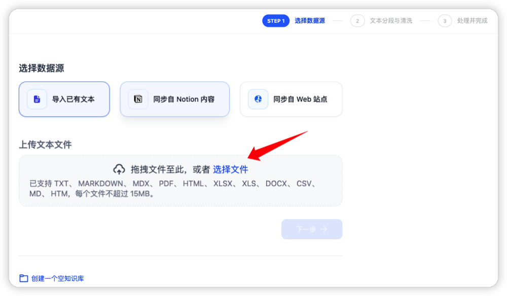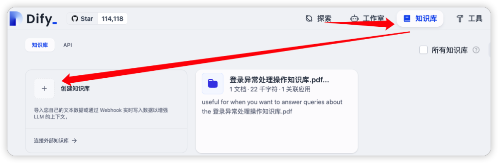 如下图所示,在 Dify 中点击“知识库”,并且“创建知识库”。