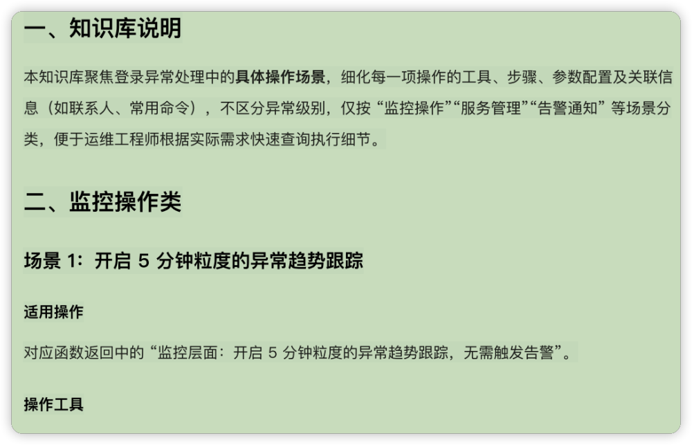 这里导入的文件就是我们的“运维知识库”。如下图所示,文件内容按照操作类型,使用场景进行分类。可以通过“代码执行”提供的解决方案在该文档中查找更多信息,从而细化解决方案。
