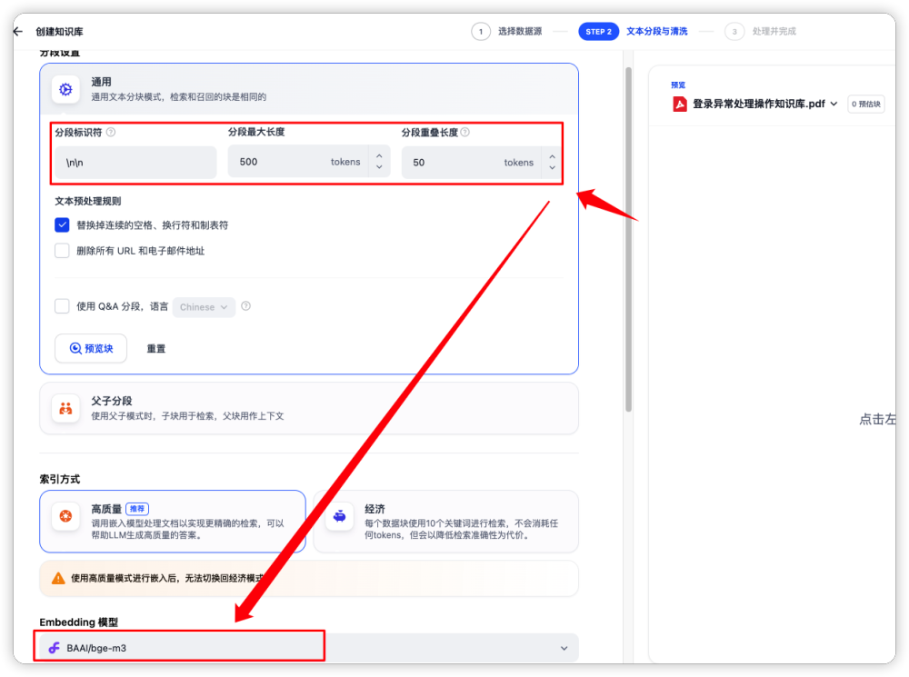 界面中可设置文本分段相关参数,如分段标识符(这里是\n\n,即两个换行符,用于标识文本分段位置)、分段最大长度(500 tokens,tokens 是模型处理文本的基本单位,限制单段文本长度)、分段重叠长度(50 tokens,控制相邻分段间重叠的 token 数量);还有文本预处理规则,比如替换连续空格、换行符等;以及索引方式(提供 “高质量” 和 “经济” 两种,影响检索精度与成本)和Embedding 模型(这里选择的是BAAI/bge - m3,Embedding 模型用于将文本转化为向量表示,助力后续检索等操作)。