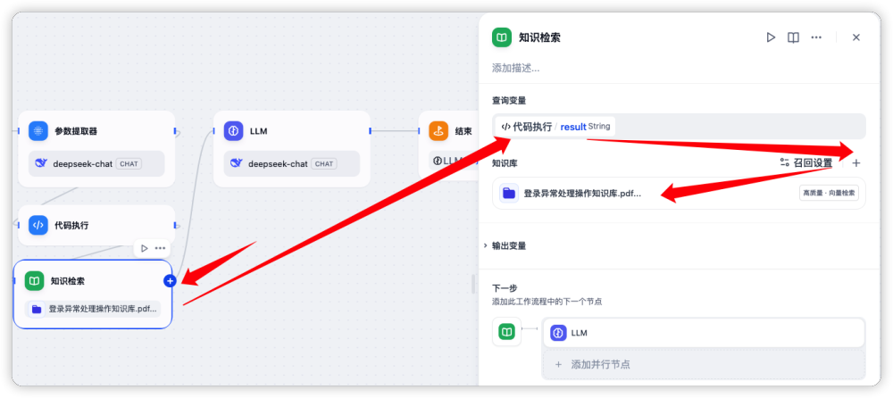 文本切割:大语言模型(LLM)在处理文本时,存在上下文窗口限制(即能同时处理的文本长度有限)。知识库中的文本可能很长,若不进行切割,超出模型上下文窗口的部分就无法被有效处理。通过按照一定规则(如基于 token 数量、特定分隔符等)切割文本,能让每一段文本都处于模型可处理的长度范围内,从而保证文本能被 Embedding 模型正确编码为向量,便于后续的检索、匹配等操作。上下文覆盖(分段覆盖):文本在自然语义上是连贯的,当进行切割时,可能会把一个完整的语义单元(比如一个完整的知识点、逻辑表述)分割到两个不同的文本段中。设置分段重叠长度,能让相邻的文本段之间有部分内容重叠。这样一来,在后续基于向量检索等操作时,即使一个问题或查询涉及的内容处于两个文本段的 “分割处”,由于有重叠部分,也能更好地捕捉到完整的语义信息,避免因文本切割而丢失上下文关联,提升知识库检索和问答的准确性。接着,我们就可以设置“知识检索”的内容,如下图所示,选择“查询变量”为“代码执行”的 result 也就是返回的“结果”,我们可以回想一下在“代码执行”中会返回“初步的方案”,这里以result 变量的方式输入到“知识检索”中。
