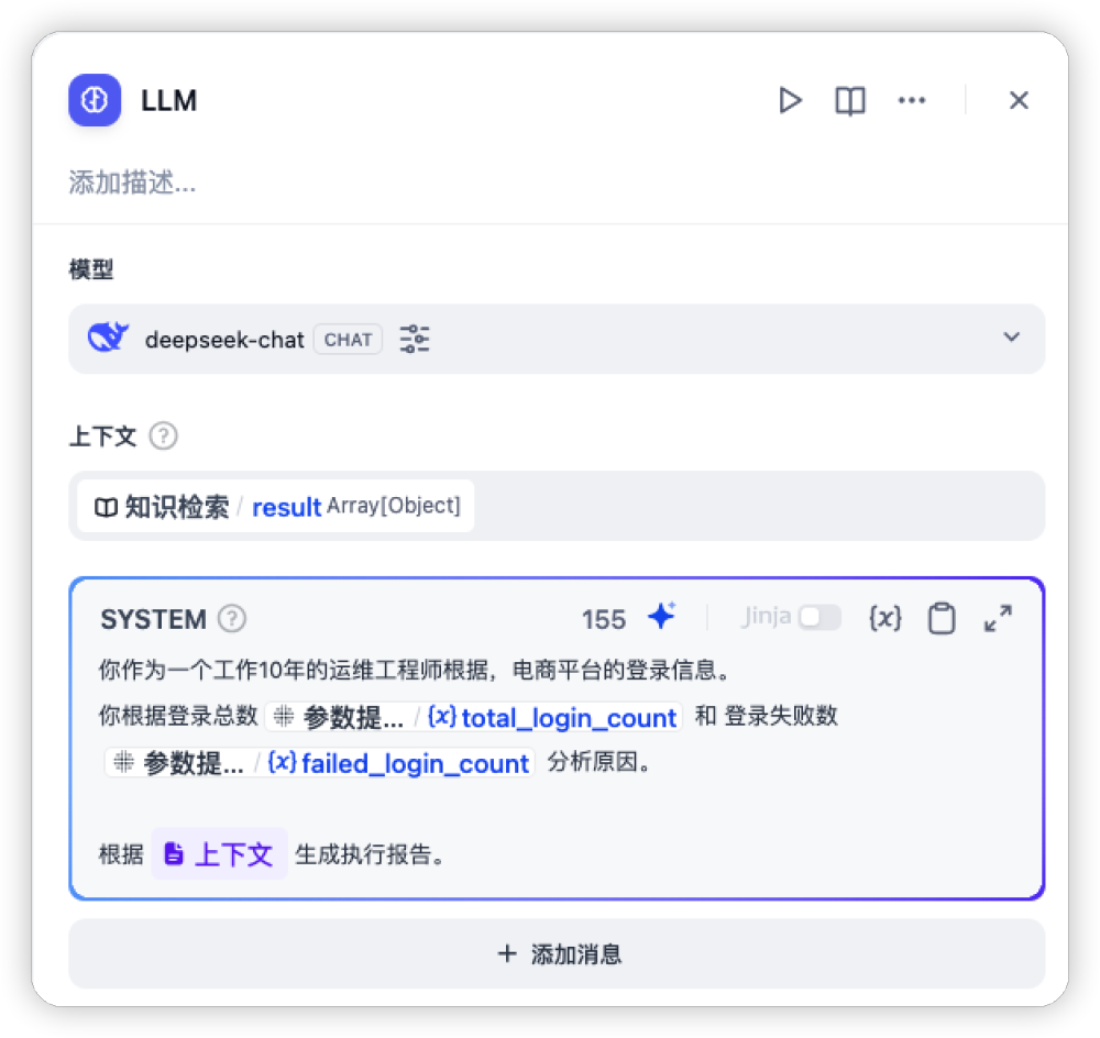 好了,到了这里就需要将细化之后的解决方案生成运维报告,指导运维工程师处理登录异常的问题。我们需要利用大模型加上提示词完成,如下图所示,在系统提示词中处理登录总人数和失败人数以外,还需要加入“上下文”。 这个“上下文”就是从知识库中检索出来的细化之后的方案。