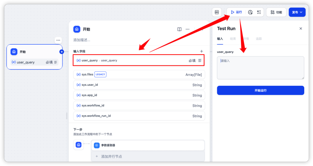 如下图所示,在工作流的“开始”节点,添加参数“user_query”,顾名思义就是用输入的参数,用来接受用户输入的内容。然后,点击右上角的“运行”按钮,在“user_query”中输入请求。