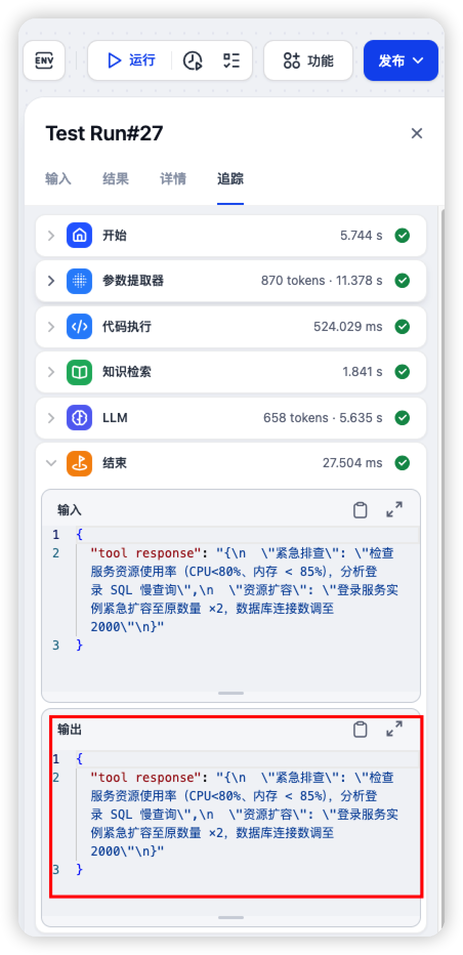 可以在右边栏中看到结果和追踪信息。如下图所示,可以查看工作流每个步骤的执行时间和执行内容, 在“结束”节点中可以看到最终结果。