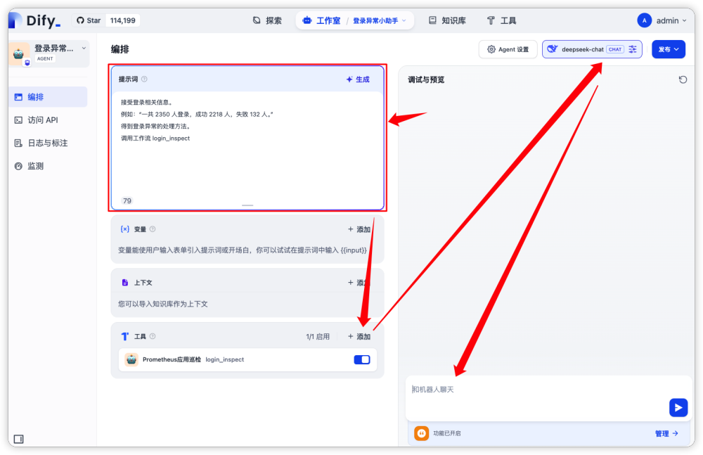复制接受登录相关信息。 例如:“一共 2350 人登录,成功 2218 人,失败 132 人。” 得到登录异常的处理方法。 调用工作流 login_inspect1.2.3.通过举例的方式告诉 Agent 提示词“长什么样子”(Few-Shot),并且告诉 LLM 调用对应的工作流:login_inspect。 这个名字就是我们把工作流发布为工具的时候,起的名字。