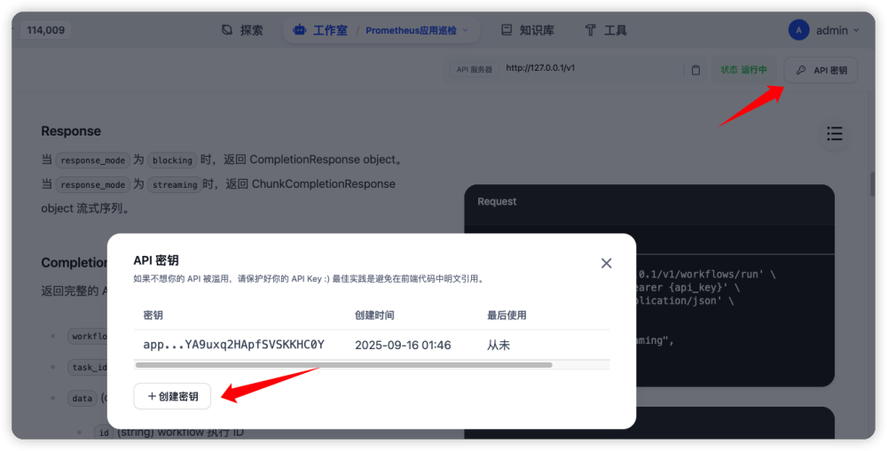 如下图所示,在 Dify 工作室右上角点击“API 密钥” 按钮,在弹出框中选择“创建密钥”,请保存好你的密钥。