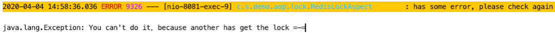 复制2020-04-04 14:55:50.864 INFO 9326 --- [nio-8081-exec-1] c.s.demo.controller.BookController : 睡眠执行前2020-04-04 14:55:52.855 INFO 9326 --- [k-schedule-pool] c.s.demo.aop.lock.RedisLockAspect : businessKey : [Business1:1024], try count : 02020-04-04 14:55:54.851 INFO 9326 --- [k-schedule-pool] c.s.demo.aop.lock.RedisLockAspect : businessKey : [Business1:1024], try count : 12020-04-04 14:55:56.851 INFO 9326 --- [k-schedule-pool] c.s.demo.aop.lock.RedisLockAspect : businessKey : [Business1:1024], try count : 22020-04-04 14:55:58.852 INFO 9326 --- [k-schedule-pool] c.s.demo.aop.lock.RedisLockAspect : businessKey : [Business1:1024], try count : 32020-04-04 14:56:00.857 INFO 9326 --- [nio-8081-exec-1] c.s.demo.controller.BookController : has some errorjava.lang.InterruptedException:sleep interrupted