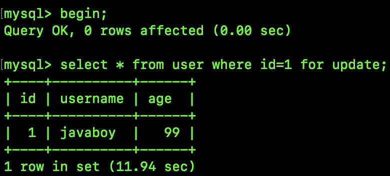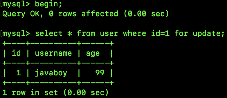 接下来我们执行如下 SQL,锁定一行数据,此时会自动为表加上 IX 锁: