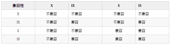 如果表上有 IS,说明表中的记录有共享锁,此时就不可以给表加排他锁(X 锁),但是可以给表加共享锁(S 锁)。如果表上有 IX,说明表中的记录有排他锁,此时就不可以给表加排他锁(X 锁),也不可以给表加共享锁(S 锁)。整体上来说,兼容关系如下表: