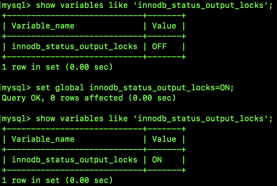 首先我们将系统变量 innodb_status_output_locks 设置为 ON,如下: