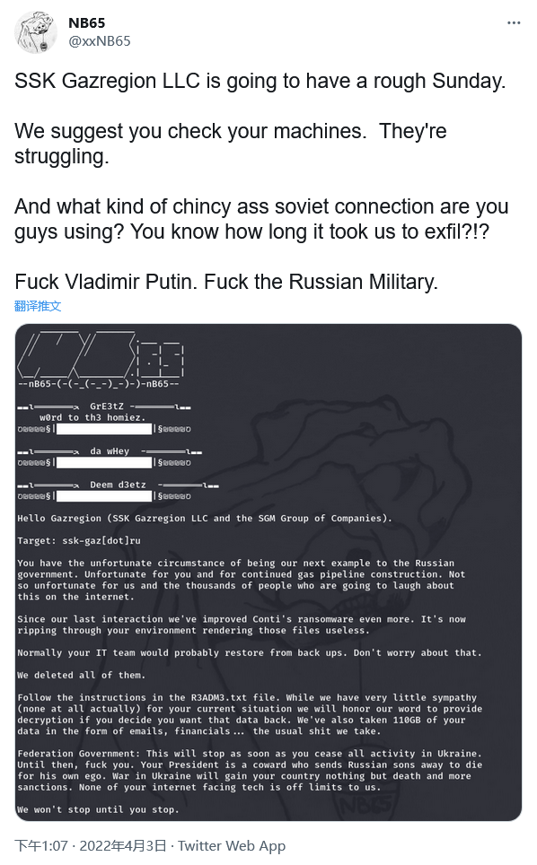 "在布查屠杀事件后之后,我们选择了针对某些公司,这些公司可能看上去是服务于民用市场的,但仍然会对俄罗斯的正常运作能力产生影响。 俄罗斯民众对普京的战争罪行的支持是压倒性的。 从一开始我们就明确表示。 我们在支持乌克兰。 我们将兑现我们的承诺。 当俄罗斯停止在乌克兰的所有敌对行动并结束这场荒谬的战争时,NB65将停止攻击俄罗斯互联网上的资产和公司。"