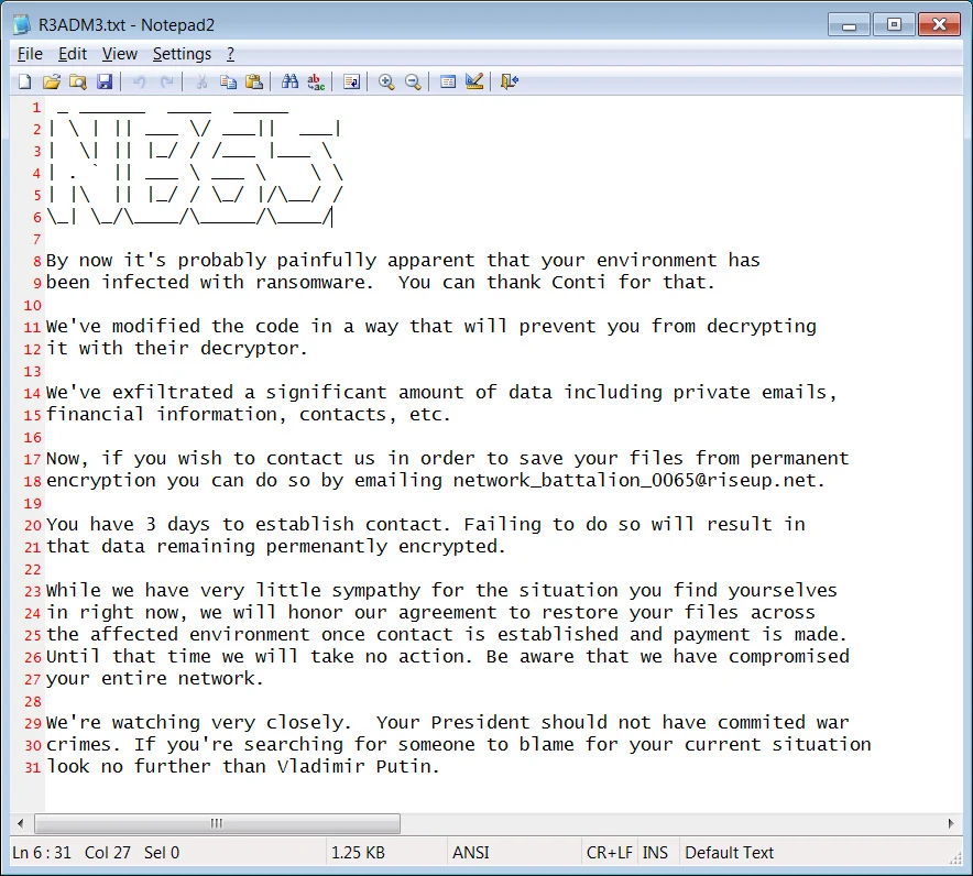 该勒索软件还将在整个加密设备中创建名为R3ADM3.txt的勒索信文本,威胁者将网络攻击归咎于总统弗拉基米尔·普京入侵乌克兰。