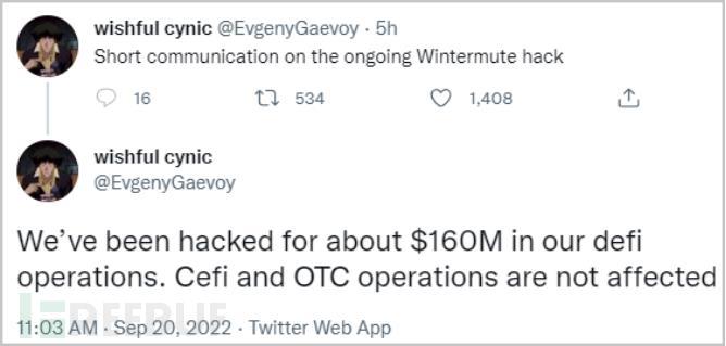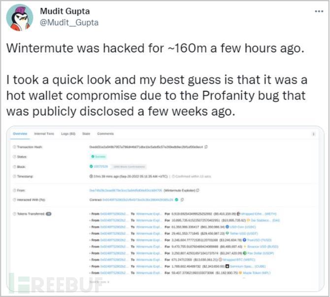 参考文章:https://www.bleepingcomputer.com/news/security/hackers-steal-162-million-from-wintermute-crypto-market-maker/
