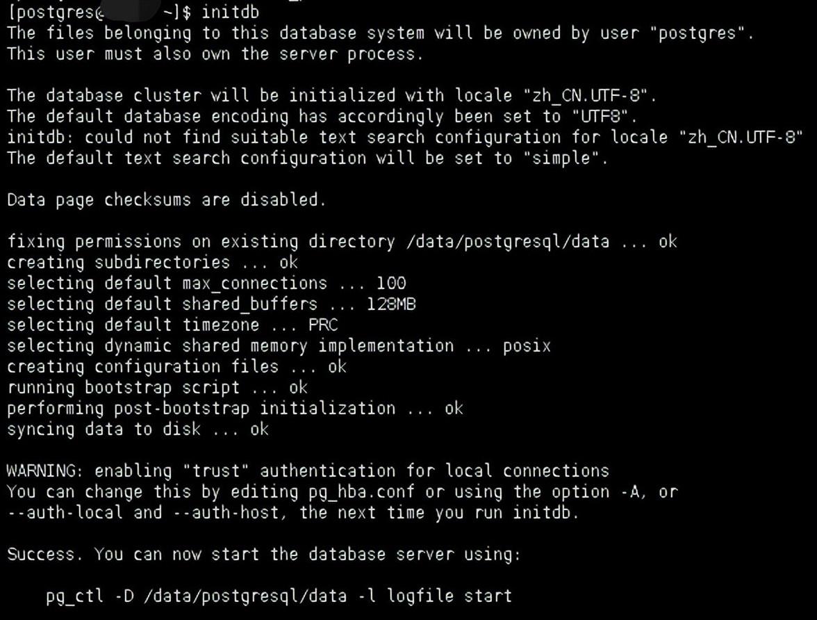 在postgres用户下运行initdb命令即可初始化数据库。