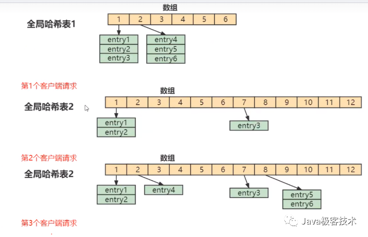 第1个请求时,把哈希表 1中的第1个索引位置上的所有 entries 拷贝到哈希表 2 中