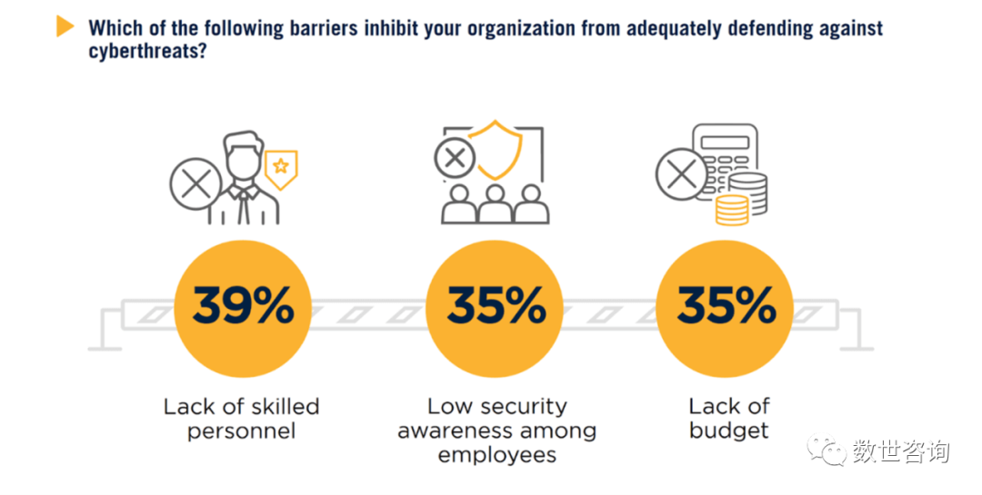 研究也努力调查了哪些潜在问题可能会阻碍企业更好地防御针对应用的攻击。受访企业认为,巩固防御的主要障碍包括安全熟手短缺(39%)、员工安全意识低下(35%)和预算不足(35%),其次是部门之间缺乏协作(29%),管理支持和意识缺失(26%)。