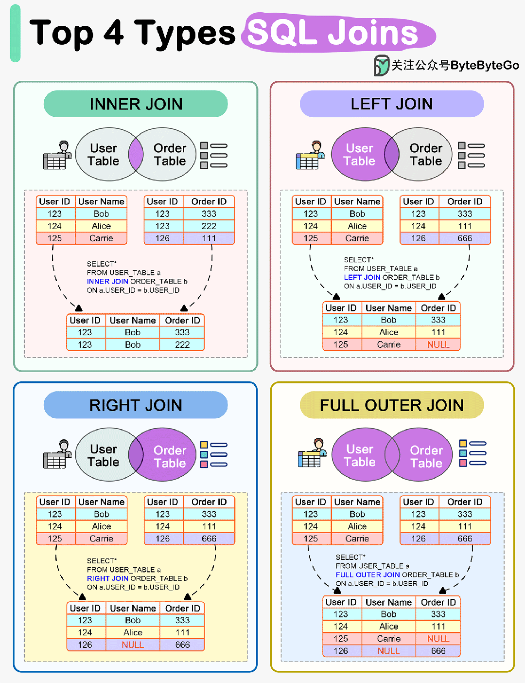 索引和缓存的使用表连接 (Join) 的顺序并发控制事务管理我们下面来看看 SQL join 如何工作?下图详细说明了 4 种 SQL join 的工作方式。