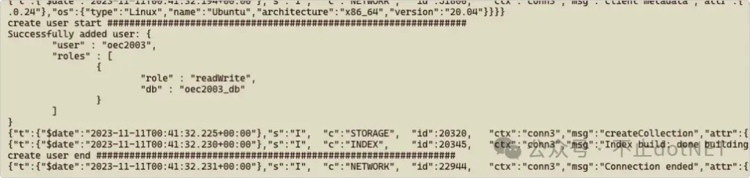 复制version: 3.8 services: mongodb: image: mongo:5.0.24 container_name: mongodb restart: unless-stopped ports: - "37017:27017" environment: MONGO_INITDB_ROOT_USERNAME: root MONGO_INITDB_ROOT_PASSWORD: Aa123456 volumes: - mongo-data:/data/db - ./config/mongo-init.js:/docker-entrypoint-initdb.d/mongo-init.js:ro volumes: mongo-data:1.2.3.4.5.6.7.8.9.10.11.12.13.14.15.16.17.18. environment 环境变量设置根账户的用户名和密码,可以理解为超级管理员账号。volumes 中映射的 mongo-init.js 文件在 MongoDB 容器第一次运行的时候会被执行,是否被执行可以通过执行 docker logs -f mongodb 命令查看日志: