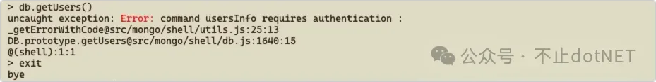 进入容器,使用 mongo 进入 MongoDB 的 shell 模式,会发现可以正常进入,但如果执行一些命令会出现没有权限的提示: