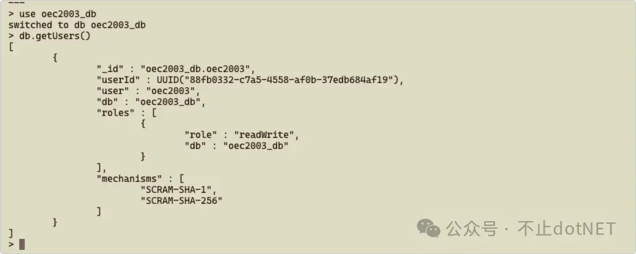 复制docker exec -it mongodb bash mongo -u root -p Aa123456 --authenticationDatabase "admin" > use oec2003_db > db.getUsers()1.2.3.4.