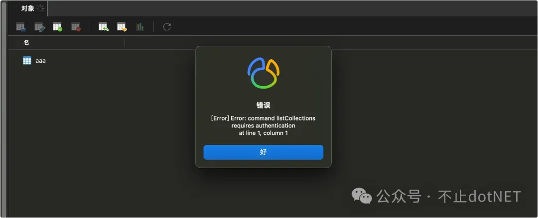 复制version: 3.8 services: mongodb: image: mongo:5.0.24 container_name: mongodb restart: unless-stopped ports: - "47017:27017" volumes: - mongo-data:/data/db command: --auth volumes: mongo-data:1.2.3.4.5.6.7.8.9.10.11.12.13.14.15.重新构建容器,这时用客户端访问数据库,或者 collection 就会出现如下提示: