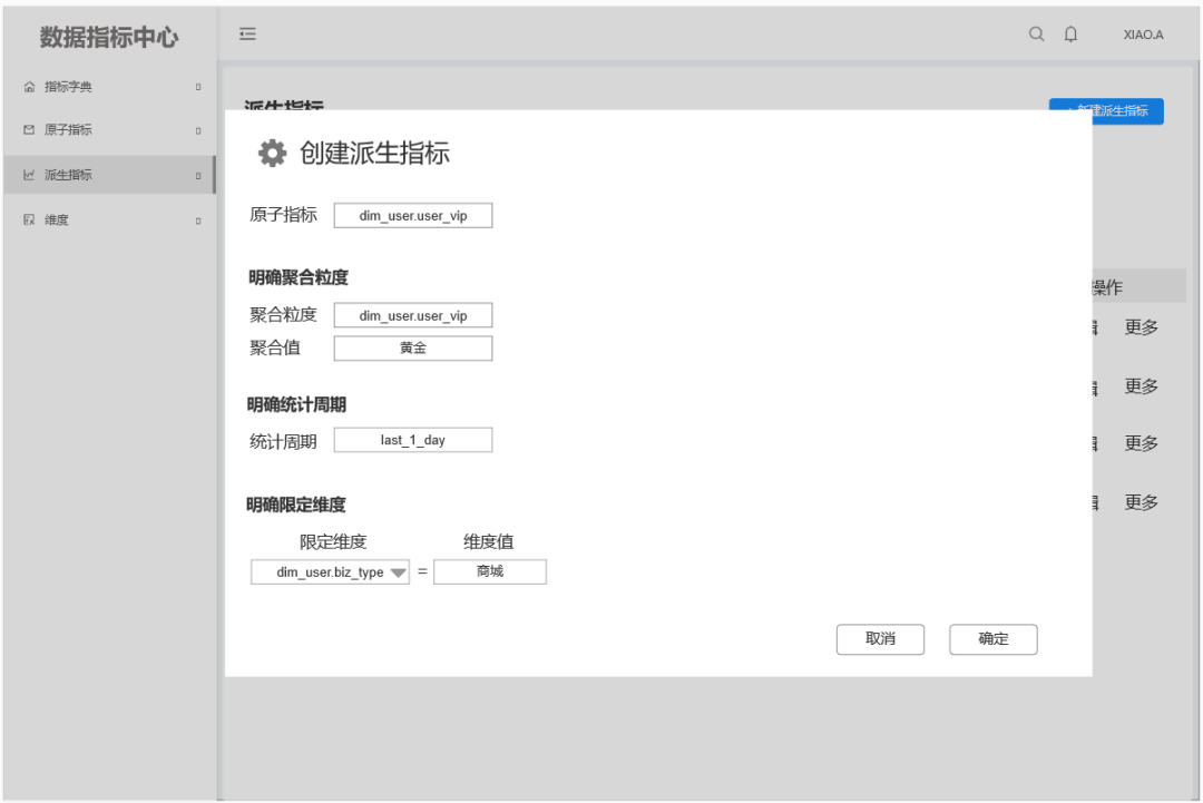 ②二级指标:即派生指标,由各业务部门自定通过指标中心生成,没有严格的开发流程,各业务部门根据需要自行创建,但需要遵守命名规范。所有维护管理工作由部门内部负责。
