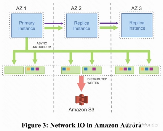 Aurora 的整体由跨 AZ 的一个主实例、多个副本(最多15个)实例及多个存储节点组成。主实例与只读实例/存储节点之间只传递 redo log 和元信息。主实例与副本实例共享一套分布式存储,因此增加副本实例是零存储成本的,这大大提高了 Aurora 的读扩展性。