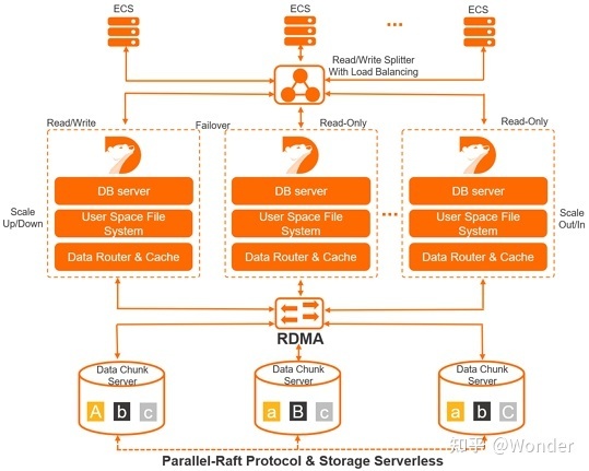 PolarDB 同样采用存储计算分离架构,计算节点是一个 MySQL 实例负责存储 SQL 解析、事务处理等,存储节点是 PolarDB 的核心组件 PolarStore,负责数据可靠存储。同一个集群的多个计算节点(1个读写实例和多个只读实例)共享一份数据,正因为如此,扩展只读实例的速度和成本都非常低。数据库实例的高可用通过只读实例在 failover 时迅速转变为读写实例保证,数据的高可用和一致性由 PolarStore 内部实现的 Parallel-Raft(支持乱序提交,性能比 raft 更好) 保证。