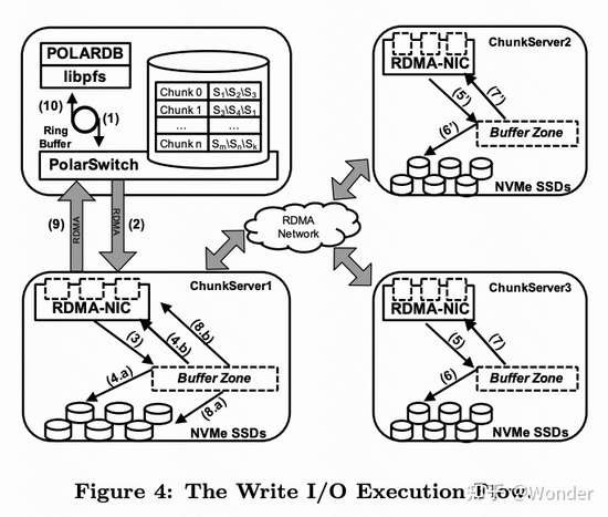 POLARDB 通过 libpfs 发送写请求经由 ring buffer 到 PolarSwitch。PolarSwitch 根据本地缓存元数据,将写请求发送至对应 Chunk 的 Chunk Server Leader 节点。请求到达 ChunkServer 后,节点的 RDMA NIC 将 Request 加入 request 队列。一个 IO 轮询线程不断轮询该请求队列,一旦发现有新请求则立即开始处理。IO 处理线程异步将请求写到 Chunk 对应的 WAL 块上(通过 SPDK),同时将请求异步发向给 Follower 节点。写请求到达 Follower 后,同样通过 RDMA NIC 将其放到 request 队列。Follower 节点上的 IO 轮询线程被触发,同样异步写入。Follower 节点的写请求成功,通过 RDMA 向 Leader 发送应答。Leader节点收到 Followers 里任一节点成功应答后,即形成 majority,同样通过 SPDK 将写请求写到相应的数据块。Leader 通过 RDMA NIC 向 PolarSwitch 返回请求处理结果。PolarSwitch 标记请求成功并通知 POLARDB 数据库实例。PolarFS 读写使用 SPDK 直接通过 DMA 操作 SSD,而非 OS 内核 IO 协议栈,通过轮询的方式监听硬件设备 IO完成事件。IO 线程和 CPU 核绑定,也不共享任何数据结构,相互之间没有竞争。这种 bypass OS IO 协议栈的方式,大大提升了高速设备的 IO 处理性能。同时通过 RDMA 网络大大提升网络 IO 性能。基本解决了 HDFS 和Ceph 等分布式文件系统存在的性能差、延迟大的问题。