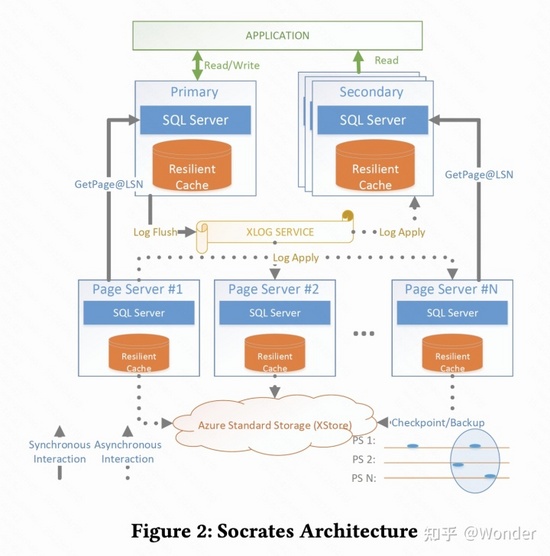 Socrates 是 Azure 在 SQL Server 基础上研发的云原生数据库,依旧采用计算存储分离的架构,和 Aurora 相比,分离的更加彻底,在存储层又将 Page 和日志存储分开,目的是将持久化和高可用分离。