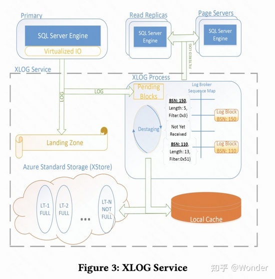 首先,读写节点直接将日志同步写到 Landing Zone(LZ) ,一个快速持久化存储服务,以降低写入延迟,它由 Azure 高级存储服务 (XIO) 实现,为了保证可靠性,数据也是三副本存储。